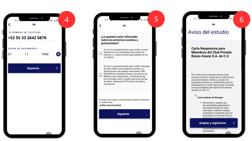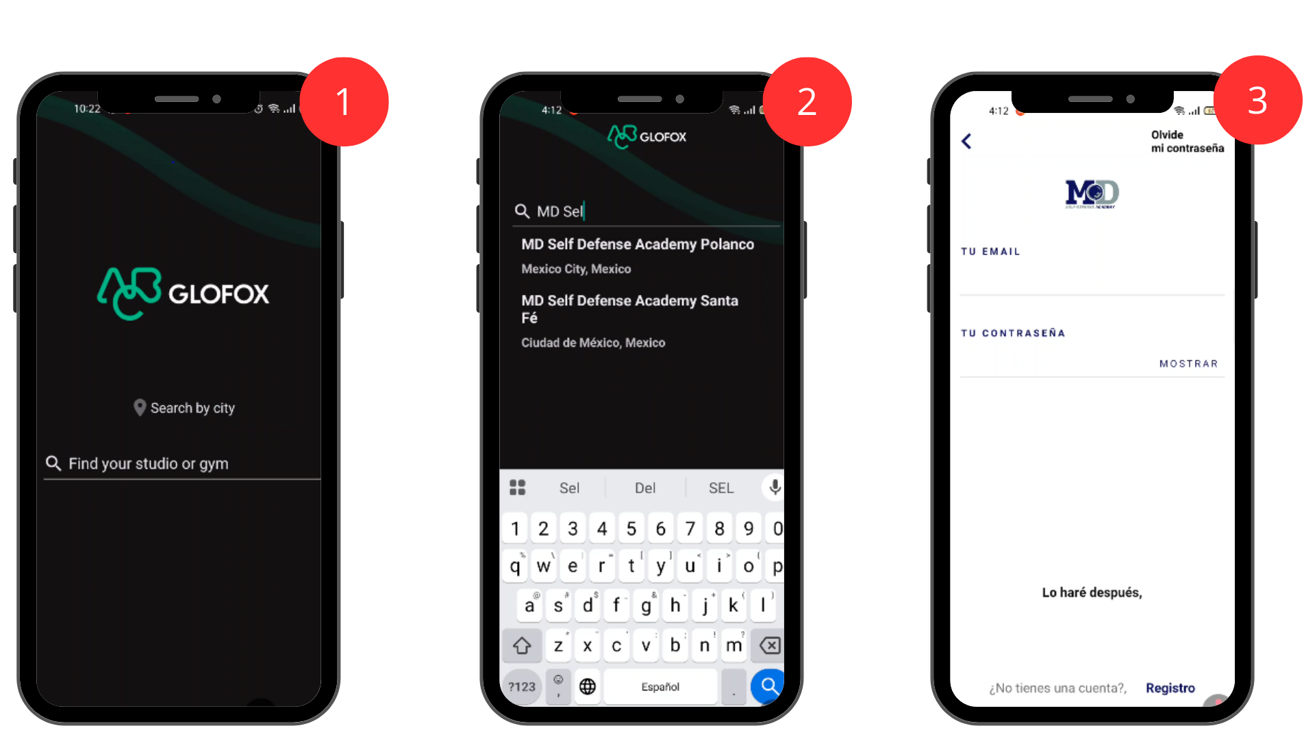 Dentro de la aplicación Glofox y con la escuela ubicada, procederemos a registrarnos.