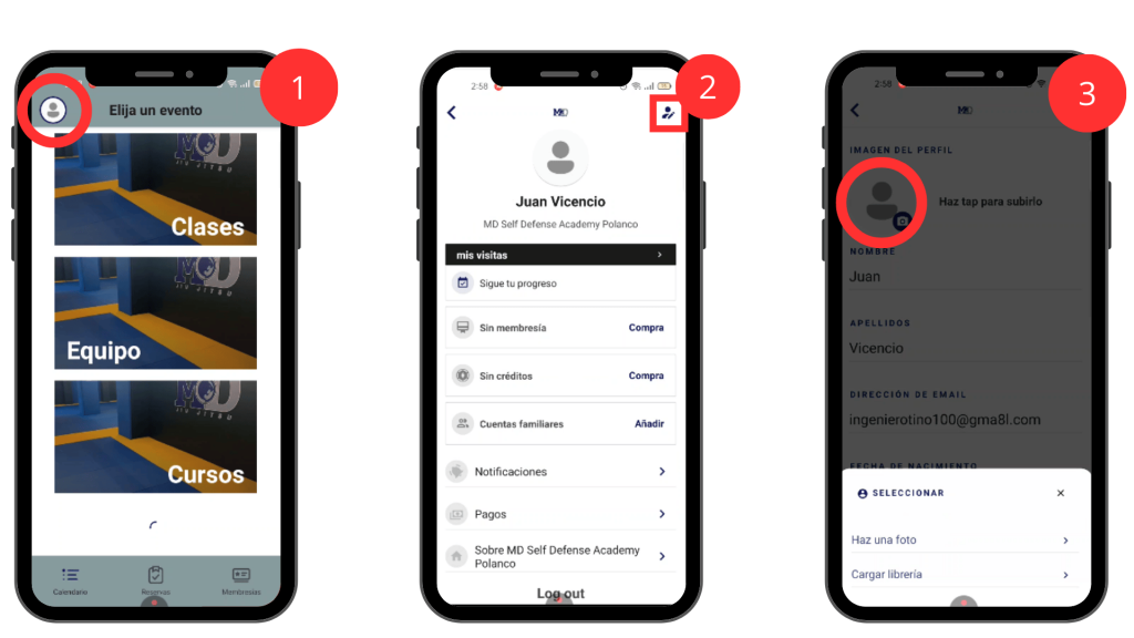3-Se mostrarán nuestros datos de perfil. Pulsamos sobre el icono de usuario y aparecerá un menú que permite elegir entre tomar una foto o cargar una imagen desde la galería.