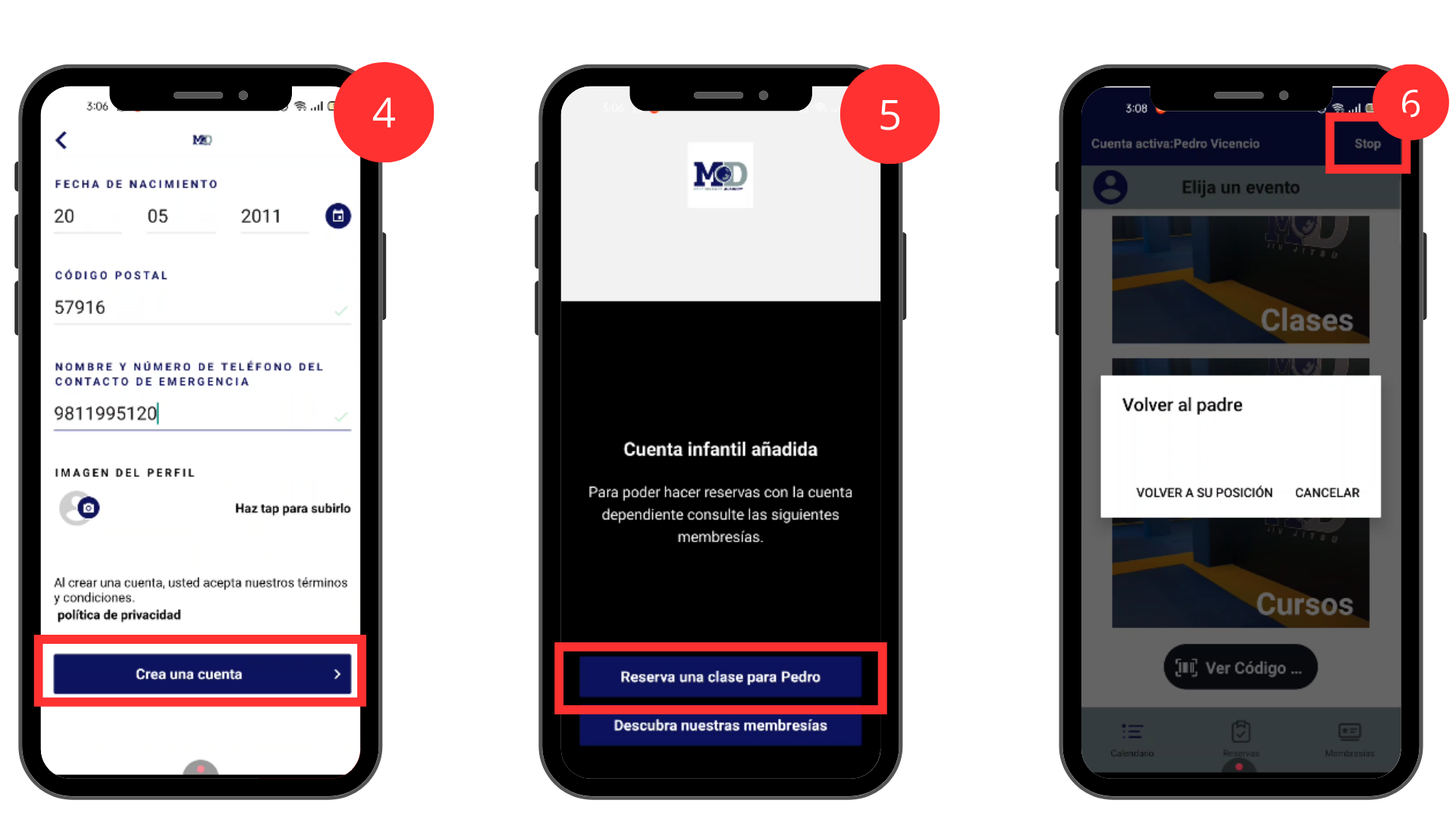 5- Se mostrará la confirmación de que la cuenta infantil ha sido agregada, y se nos permitirá reservar alguna clase.