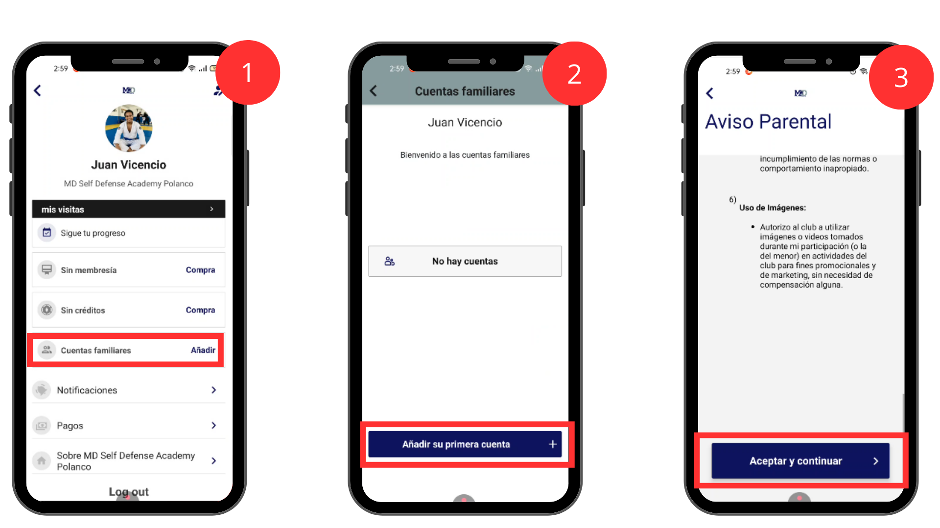 2- En la vista de cuentas familiares se observa que no hay cuentas registradas. Para agregar una cuenta nueva, pulsamos el botón “Añadir su primera cuenta”.